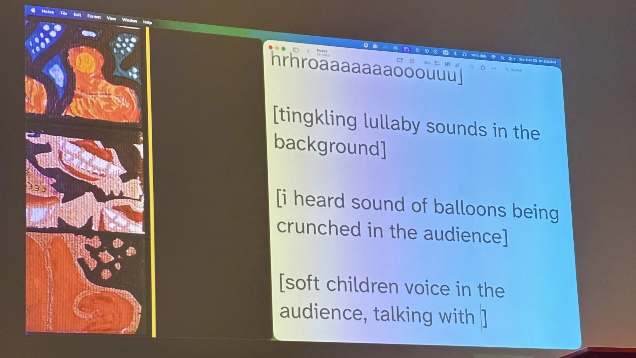 Sound captions projected on a wall. They read, “[hrhroaaaaaaaooouuu] [tingkling lullaby sounds in the background] [i heard sound of balloons being crunched in the audience] [soft children voice in the back].” Photo: Frances Breden. Event: In Conversation exhibition, 2025.
